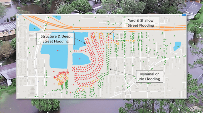 The pump station was overwhelmed by heavy rainfall during Hurricane Ian, resulting in over 100 flooded homes. The small colored circles represent individual homes and streets in the neighborhood and are referred to as Flood Risk PointsTM.